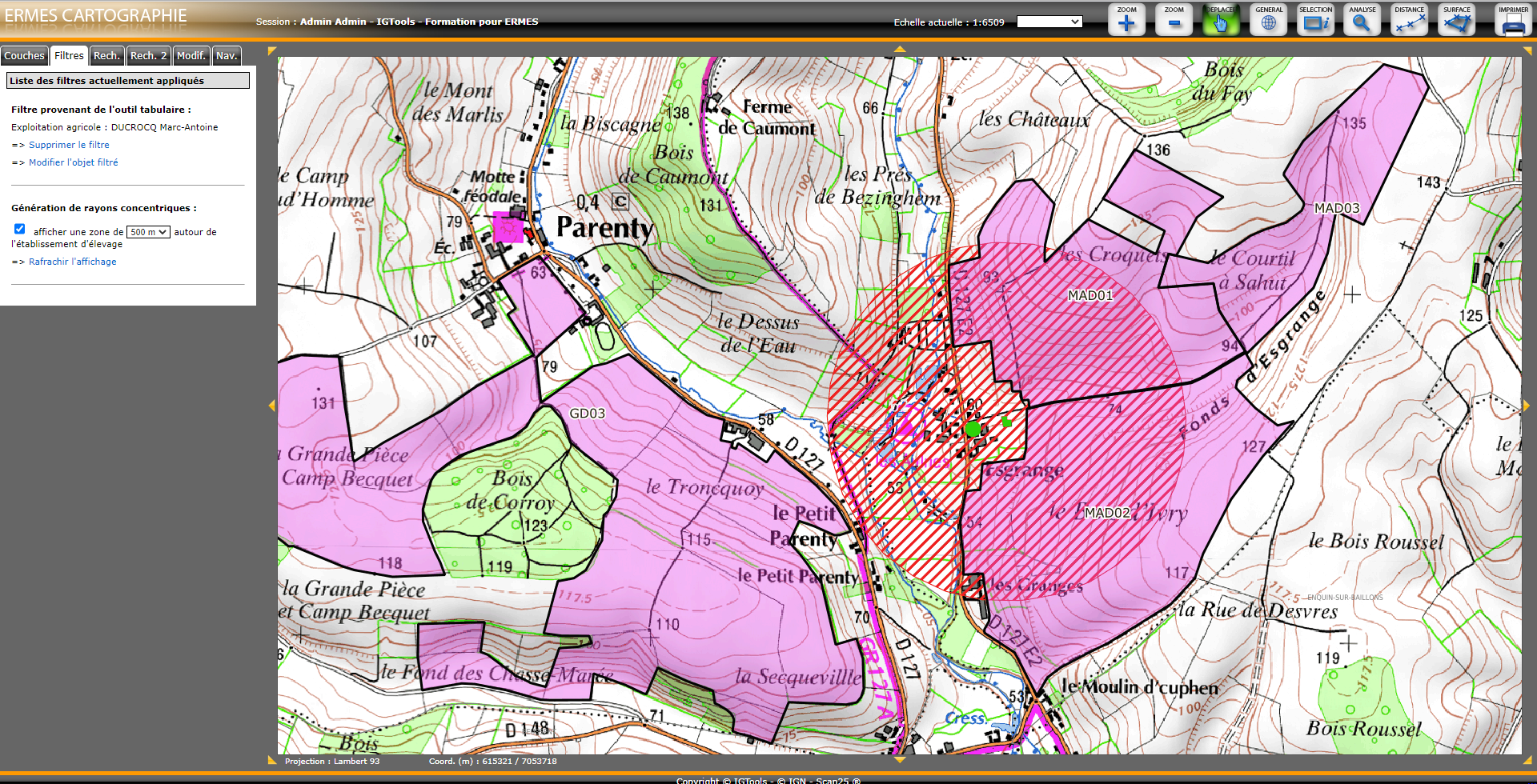 Créer vos exploitations agricoles, gérer leur parcellaire (à partir des fichiers TelePAC ou autres), les assolements des exploitants, leur cheptel. Toutes les données sont géolocalisées, vous pouvez éditer facilement des tableaux de bords ou des cartes à l’exploitation agricole. Avec ERMES vous pouvez aussi calculer des indicateurs agronomiques à l’échelle de l’exploitation et ainsi vérifier le bon équilibre de la fertilisation.