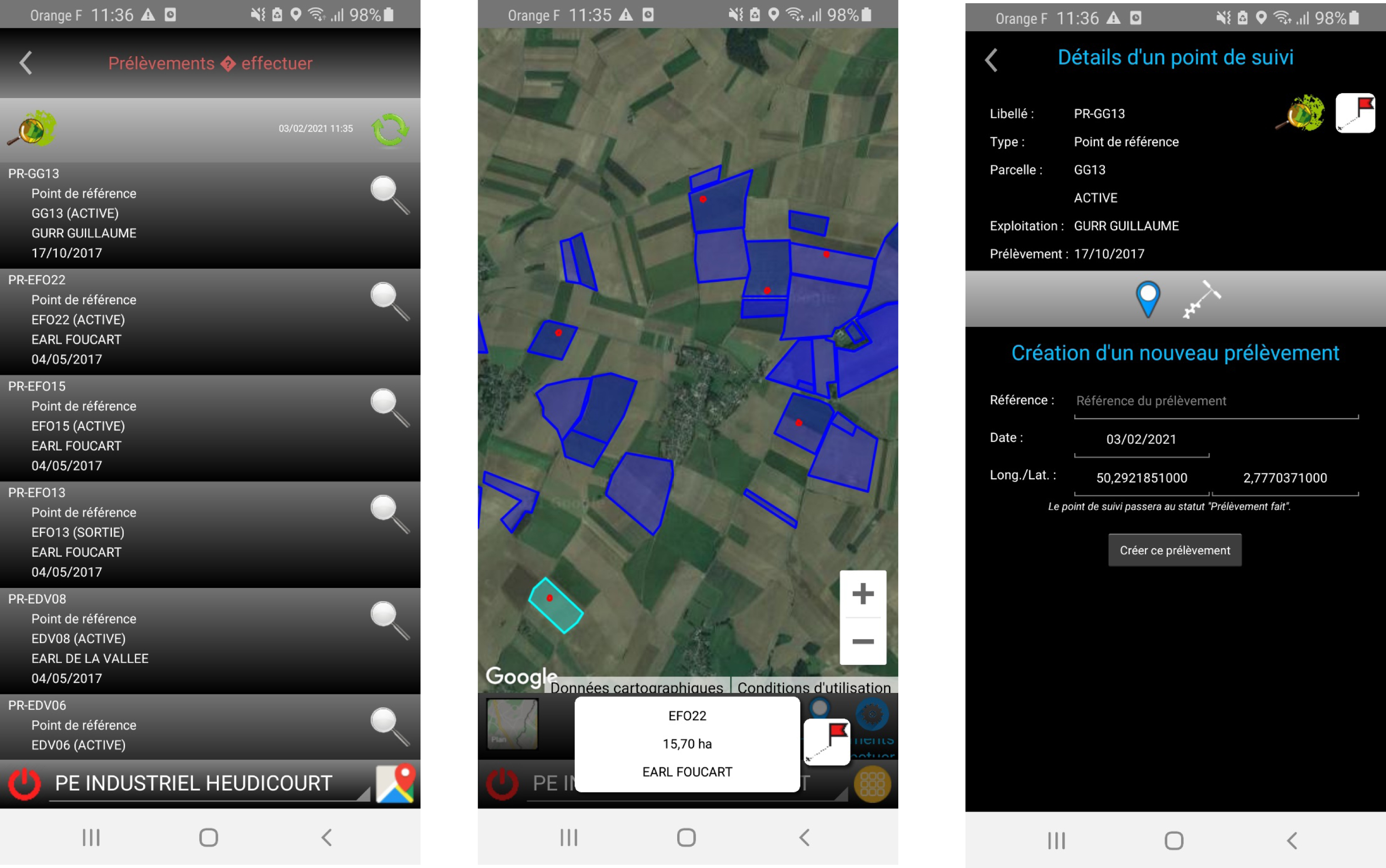 Sur la base de votre prévisionnel vous pouvez aussi visualiser les Points de suivi de sols pour lesquels vous devez faire des prélèvements pour réengager des parcelles à l’épandage. ERMES vous permet de notifier les analyses de sol à réaliser et génère un tableau de bord de ces analyses ainsi qu’une carte avec les sondages à réaliser. Cette donnée est disponible pour le préleveur dans son espace réservé sur ERMES Mobile. Il peut visualiser les prélèvements à réaliser et renseigner les références. Les éléments remontent directement dans votre compte ERMES Central.