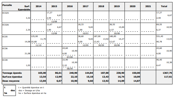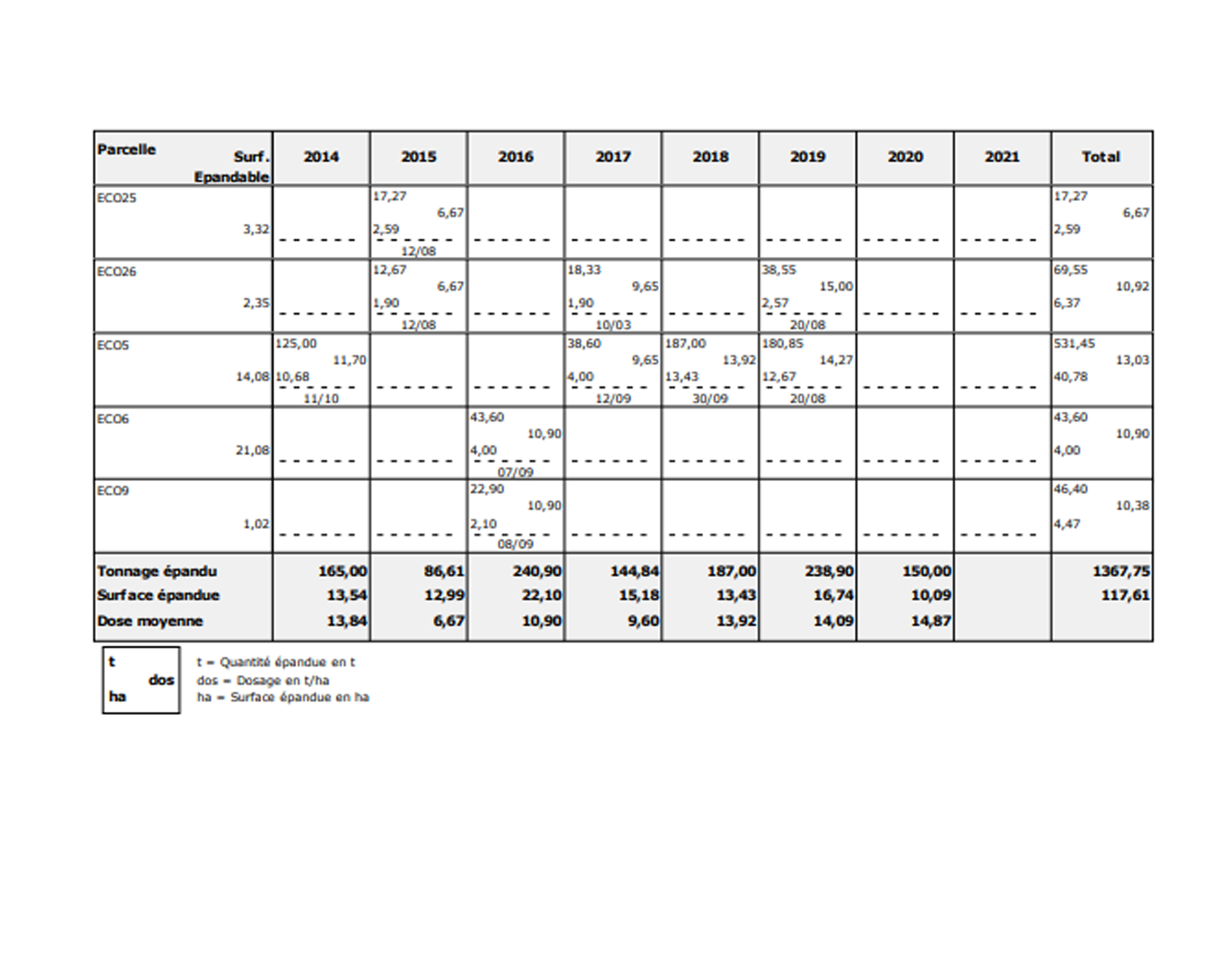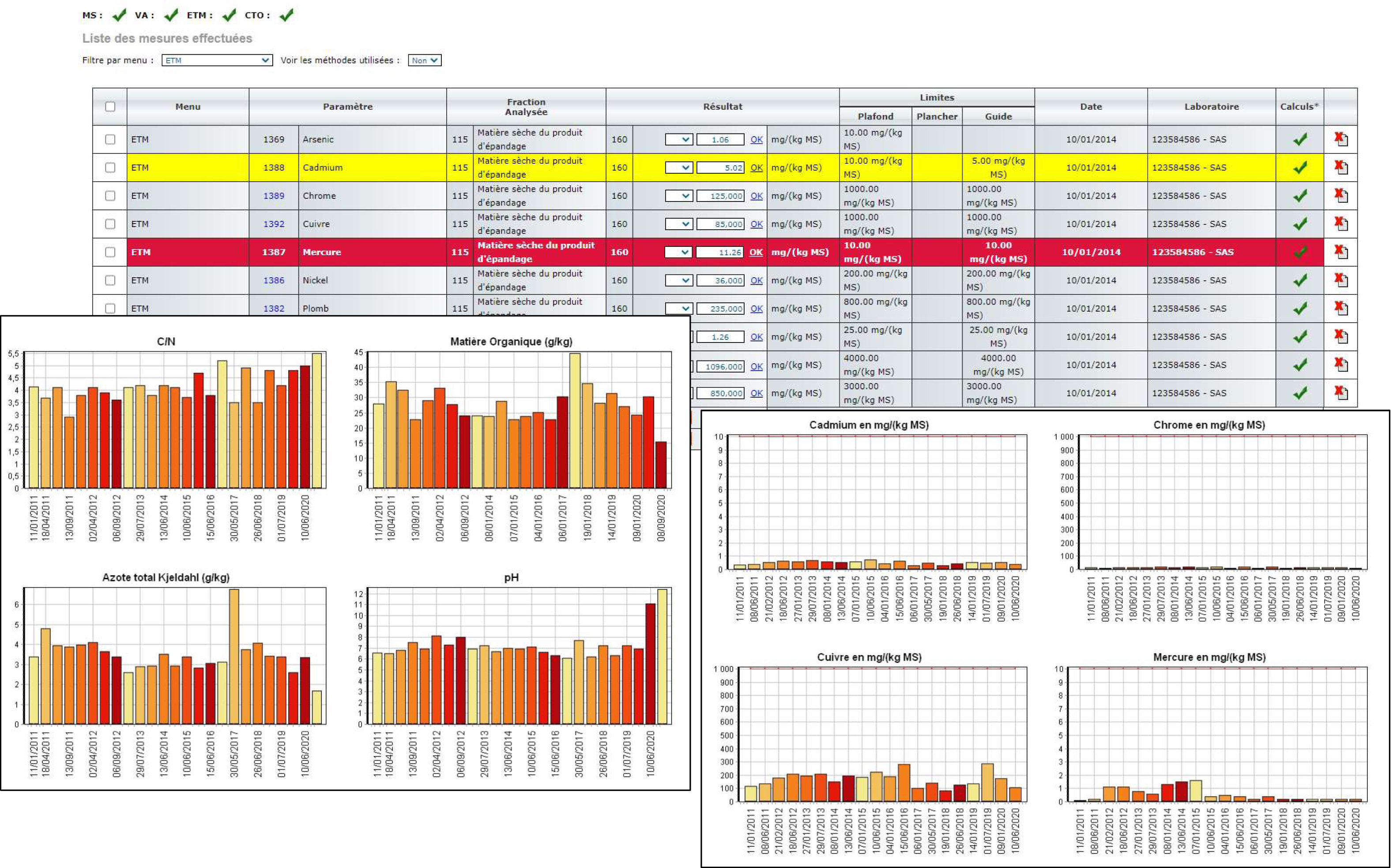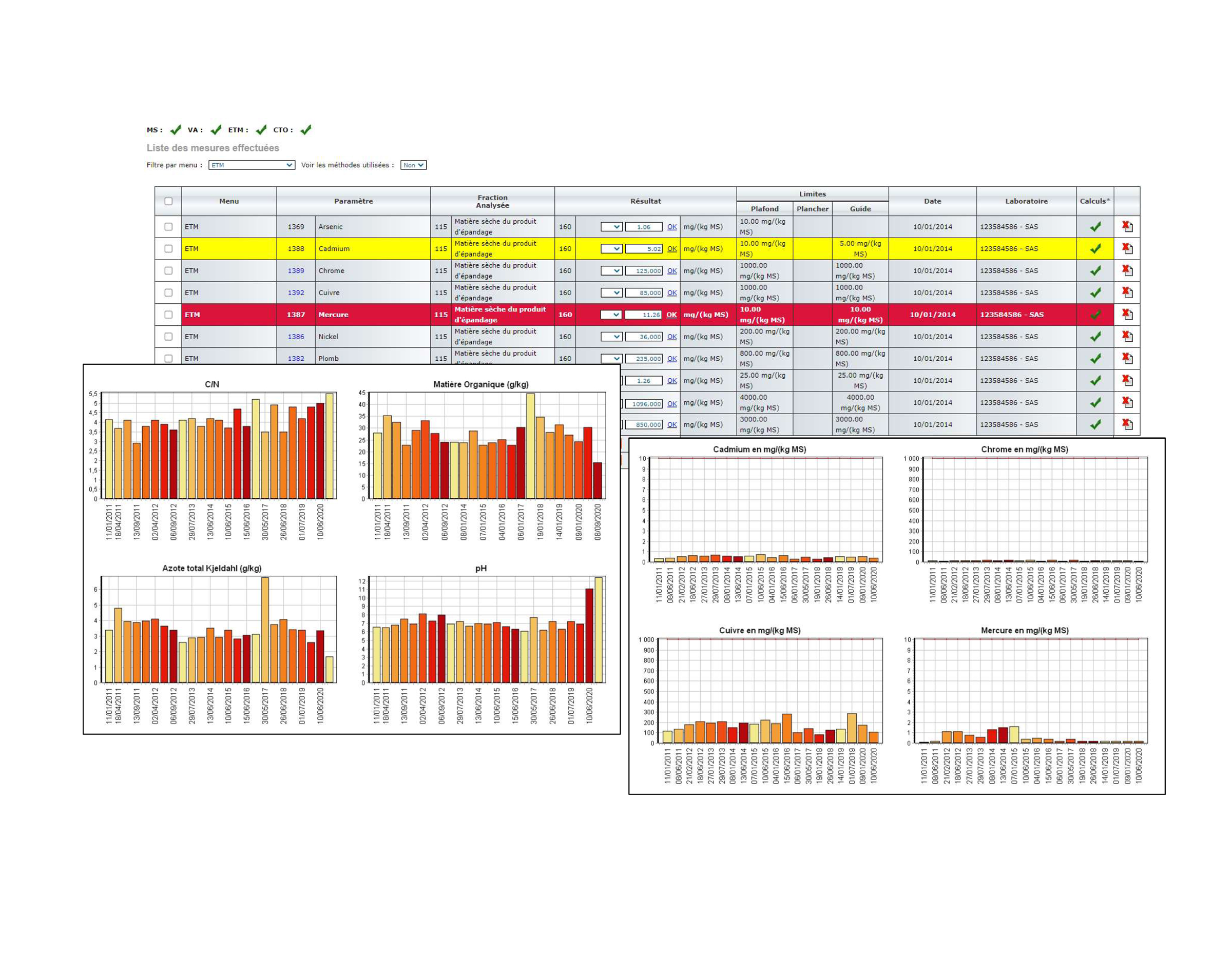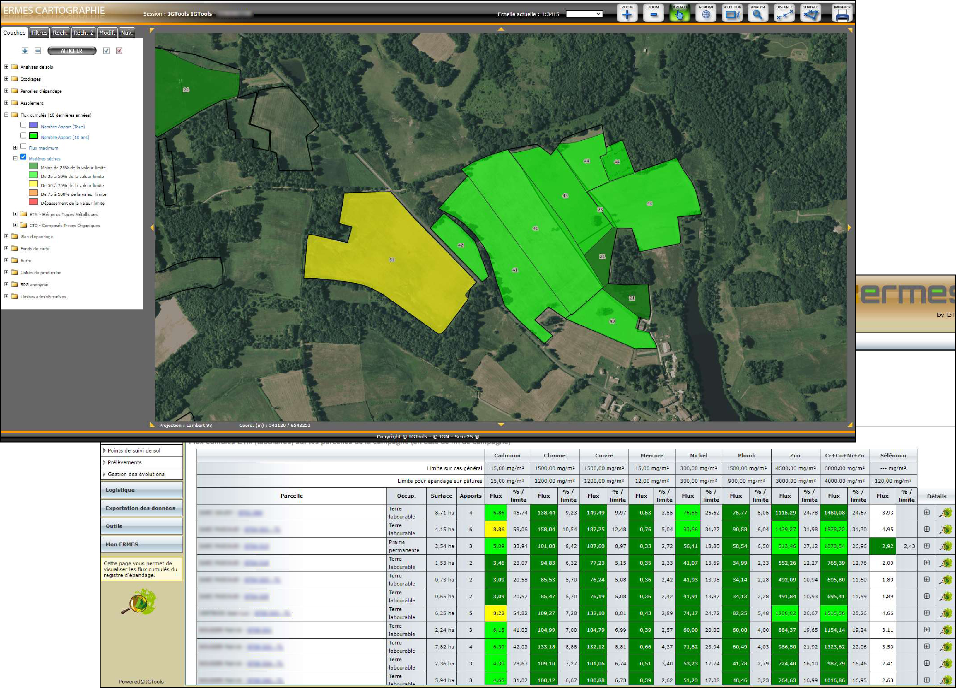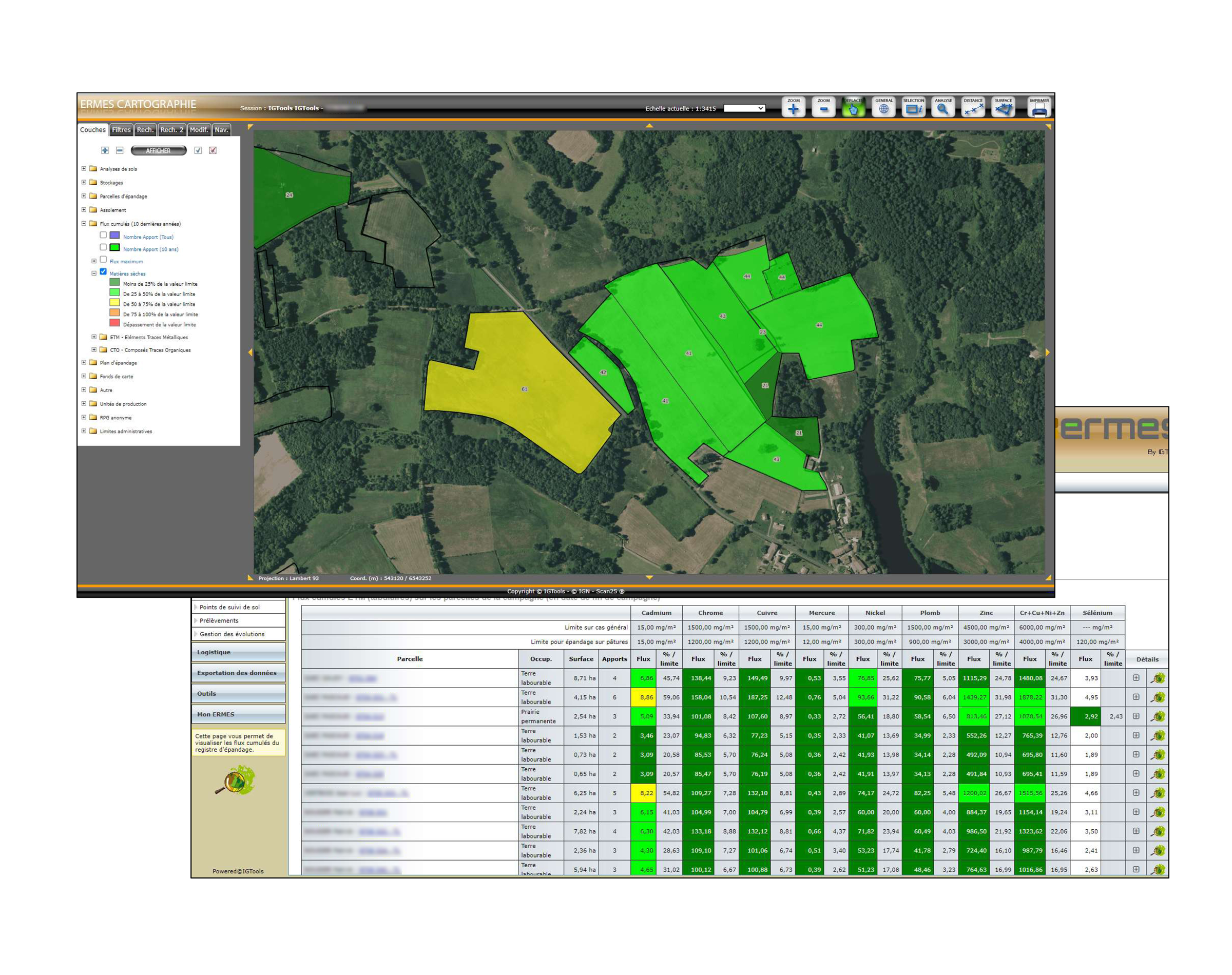 En fonction des lots épandus, de leurs analyses, des quantités et surfaces épandues, ERMES vous calcule automatiquement les flux cumulés sur les 10 dernières années. Ces flux sont calculés sur plusieurs paramètres : Matière Sèche (MS), les Eléments Traces Métalliques (ETM : Arsenic, Cadmium, Chrome, Cuivre, Mercure, Nickel, Plomb, Sélénium, Zinc) ou les Composés Traces Organiques (CTO : benzo(a)pyrène, benzo(b)fluoranthène, Fluoranthène, PCB). Les flux peuvent intégrer les flux générés par plusieurs plans d’épandage pour une même parcelle.